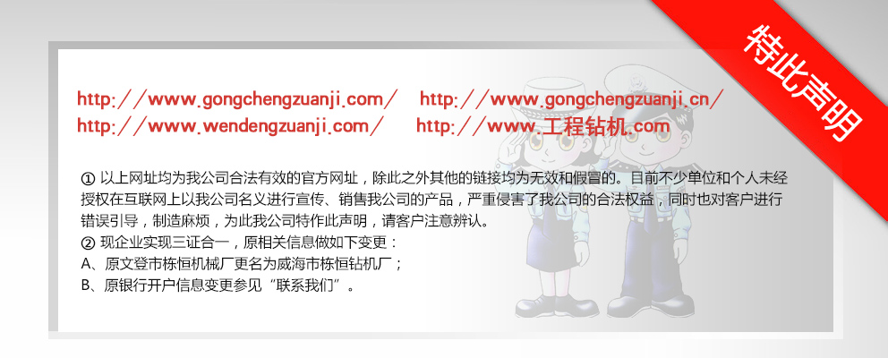 威海市棟恒鉆機(jī)廠隸屬于文登市工程鉆機(jī)廠,主要生產(chǎn)、銷售工程鉆機(jī)。它坐落于文登市西鋪頭工業(yè)園,這里科技發(fā)達(dá),交通便利,制造業(yè)集中。 自1982年建廠以來(lái),經(jīng)過(guò)多年的優(yōu)化改革和沉淀積累,擁有精密、大型加工設(shè)備近百臺(tái)的生產(chǎn)企業(yè)之一。現(xiàn)在研制成功的GJ-400、GJ-250S、GJ-250A、GJ-240S、GJ-240A、GJ-180S、GJ-180A型等鉆機(jī)。在其它產(chǎn)品上,企業(yè)建立了長(zhǎng)期、中期、短期的發(fā)展規(guī)劃,一系列的高性能產(chǎn)品正在不斷推出中,企業(yè)應(yīng)市場(chǎng)需求對(duì)系列產(chǎn)品進(jìn)行了優(yōu)化組合,開發(fā)了與之對(duì)應(yīng)配套的三腿、四腿單天車輪、雙天車輪鉆塔;泥漿泵—BW-160Q、BW- 200Q型球形閥泥漿泵大大提高了泵的使用性能和機(jī)械效率